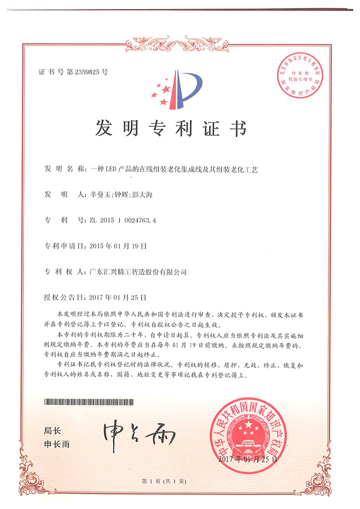 《一種LED產(chǎn)品的在線組裝老化集成線及其組裝老化工藝》發(fā)明專利證書